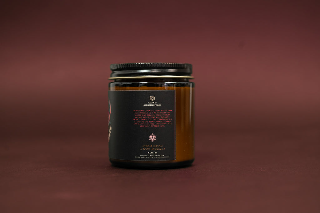 Ingredients: Aqua (distilled water). Cera alba (beeswax). Peg-40 (hydrogenated castor oil). Garcinia indica (kokum butter). Emulsifying wax. Cannabis sativa L. (hemp seed oil). Fragrance oil / Essential oil blend. Phenoxyethanol (and) caprylyl glycol (and) sorbic acid. Vegetable glycerin. Love.